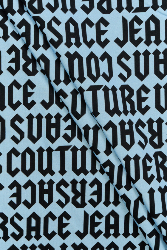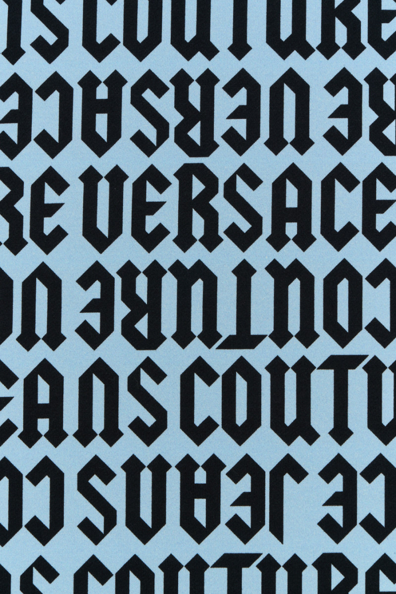 Italienischer Sweatshirt-Stoff aus 100 % Baumwolle mit einem Motiv aus schwarzen Inschriften auf blauem Hintergrund. Das Muster ist dicht und regelmäßig, die Buchstaben sind 4 cm hoch. Das Gestrick ist fleischig, weich, elastisch, matt und die linke Seite ist mit einem Flaum versehen. Ein fantastisches Angebot für Fans von signierten Stoffen, mit denen Sie Hosen, Sweatshirts und Tuniken nähen können.