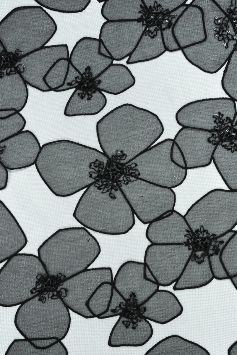 Italienischer Tüll mit klassischen schwarzen Ösen mit einem Motiv aus großen, schwarzen Blüten aus leicht gewelltem Organza. Die größeren Blüten sind 20 cm * 23 cm lang, die kleineren 10 cm * 14 cm. Das Muster ist dicht auf eine Breite von 135 cm gelegt, der gesamte Tüll ist 160 cm breit. Die Blüten überlappen sich, ihre Mitte ist mit kleinen, schwarzen Pailletten verziert. Das Material ist transparent, flexibel, leicht steif und die Blüten selbst haben einen sehr zarten Glanz. Ein origineller Stoff, aus dem Sie Kleider, Röcke und Blusen herstellen können.