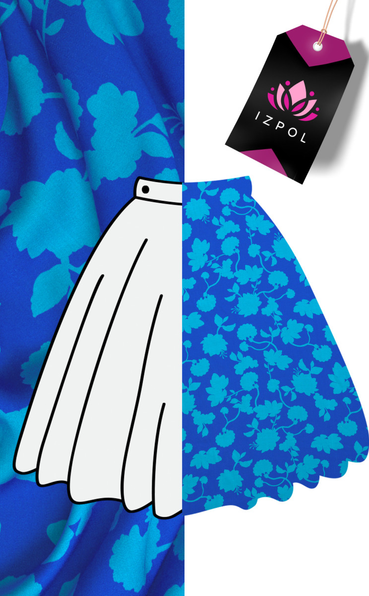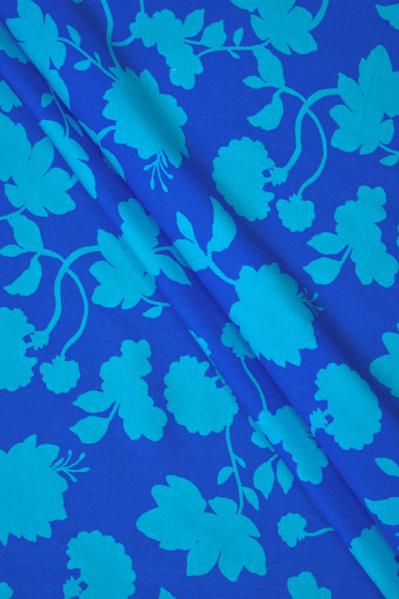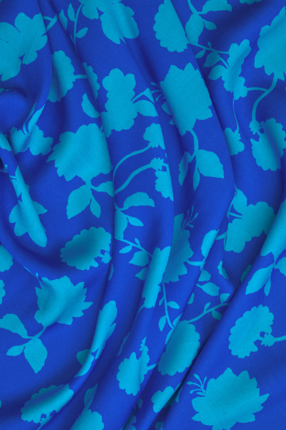 Italienischer Stoff aus 100% Viskose in Kornblumenfarbe mit einem dichten Motiv aus türkisfarbenen Blüten. Der Druck ist sehr charakteristisch und zeigt nur die Formen von Blumen. Der Stoff ist unelastisch, weich und blickdicht und fühlt sich sehr angenehm an. Diese Art ist perfekt für heiße Sommertage.