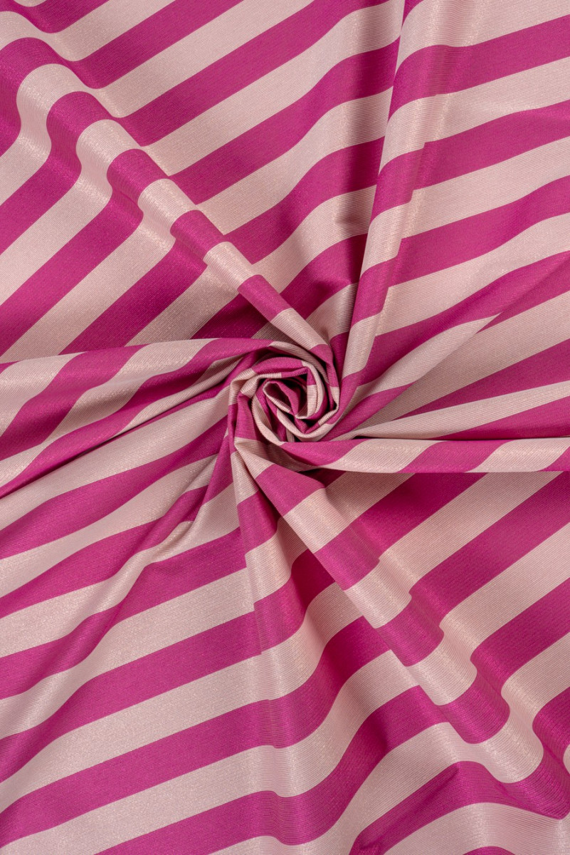 Eleganter Jacquard mit 4 cm breiten Streifen in hellrosa und rosa Farben, die mit Lurexfaden funkeln.