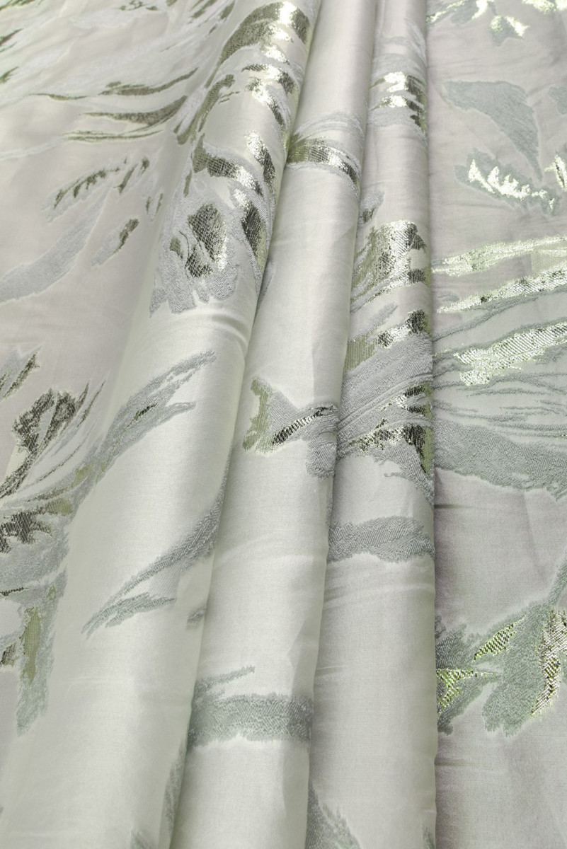 Exklusiver cremefarbener Jacquard mit einem großen grauen Muster mit einem Hauch von Grün und dem Zusatz von goldenem Lurexfaden. Der Stoff ähnelt in seiner Struktur Taft. Ein schönes Angebot für ein Kleid, einen Rock, eine Jacke, einen dünnen Mantel.