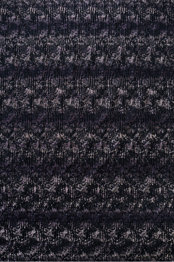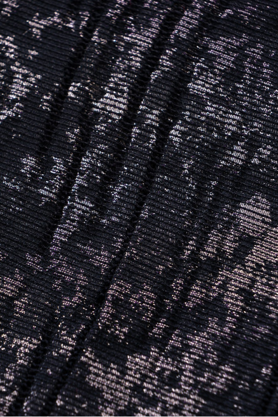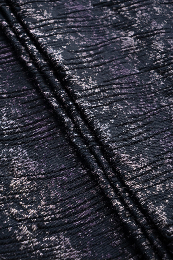 Italienischer Jacquardstoff in Schwarz-, Lila- und Beigetönen. Stoff leicht elastisch, glänzend mit knitterndem Effekt.