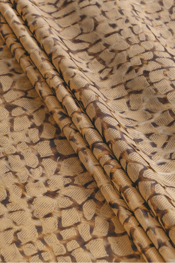 Italienischer Jacquard Kostümstoff mit einem Kleintiermotiv (3 cm) ähnlich einer Giraffe in beige-braunen Farben.
