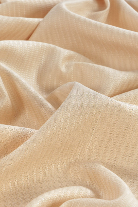 Italienischer Jacquard Kostümstoff aus Naturwolle und Naturseide. Motiv aus kleinen Zickzacks in hellbeige Farbe. Stoff dicker, fleischig - ideal zum Nähen eines Kostüms, jacke, Mantel.