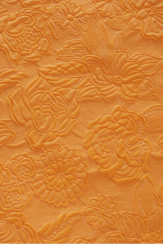 Italienischer Jacquard-Trachtenstoff mit einem dichten Motiv aus gequetschten Blumen. Das Ganze ist in einer schönen orangefarbenen Farbe gehalten. Der Stoff ist unelastisch, steif und sehr effektiv. Es eignet sich perfekt zum Nähen eines Frühlingsmantels, eines glamourösen Anzugs oder eines Kleides.