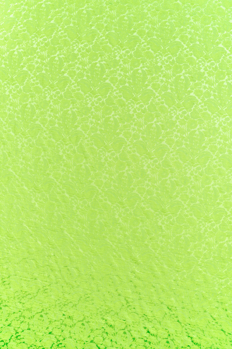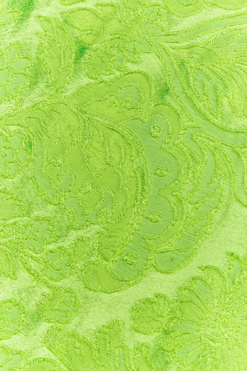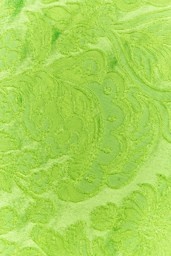 Elastischer Jacquard in der Farbe Neon Limette. Der Stoff ist in einem konvexen Paisley-Muster mit einem seidenmatten Finish gewebt, das ihm Eleganz verleiht.