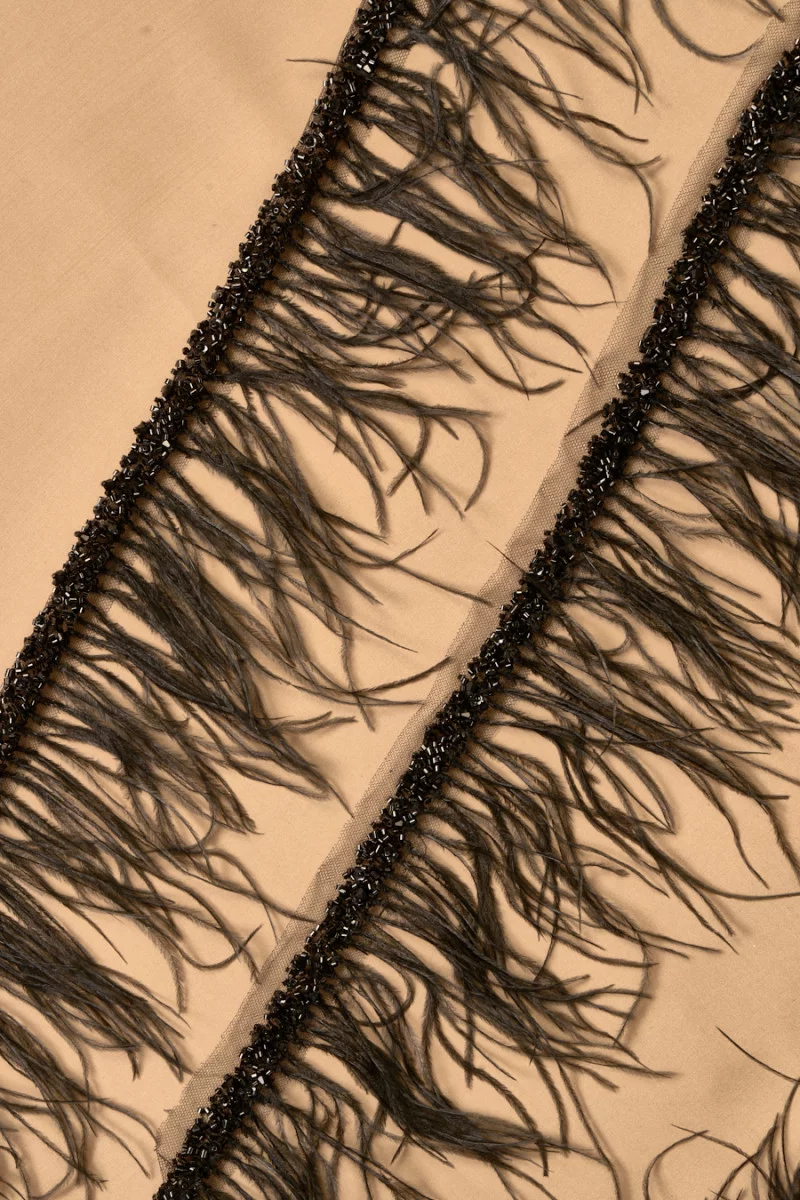 Exklusives italienisches Band in Schwarz, dicht verziert mit schwarzen Perlen und schwarzen Federn. Perlen auf Tüll sind 1,5 cm breit, zarte Federn sind nicht gleich lang, von 9 cm bis 16 cm. Ein sehr eleganter Vorschlag, um ein Kleid oder eine Bluse zu dekorieren. Ein Klebeband für Fans von zeitlosem Schwarz mit modernem Twist.