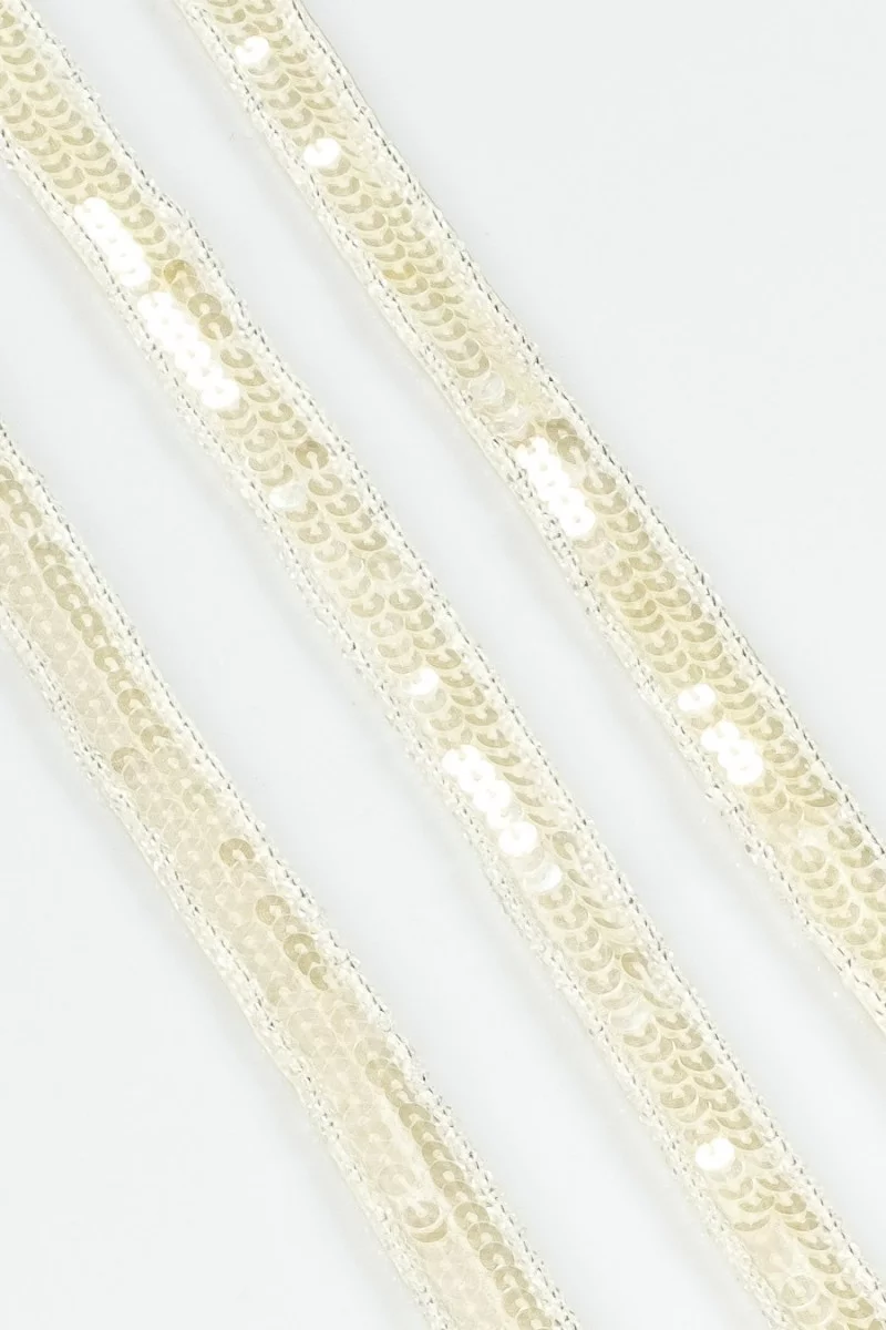 Italienisches Kurzwarenband in Ecru-Farbe. Die Mitte ist mit Pailletten verziert und die Kanten sind mit Perlen besetzt.