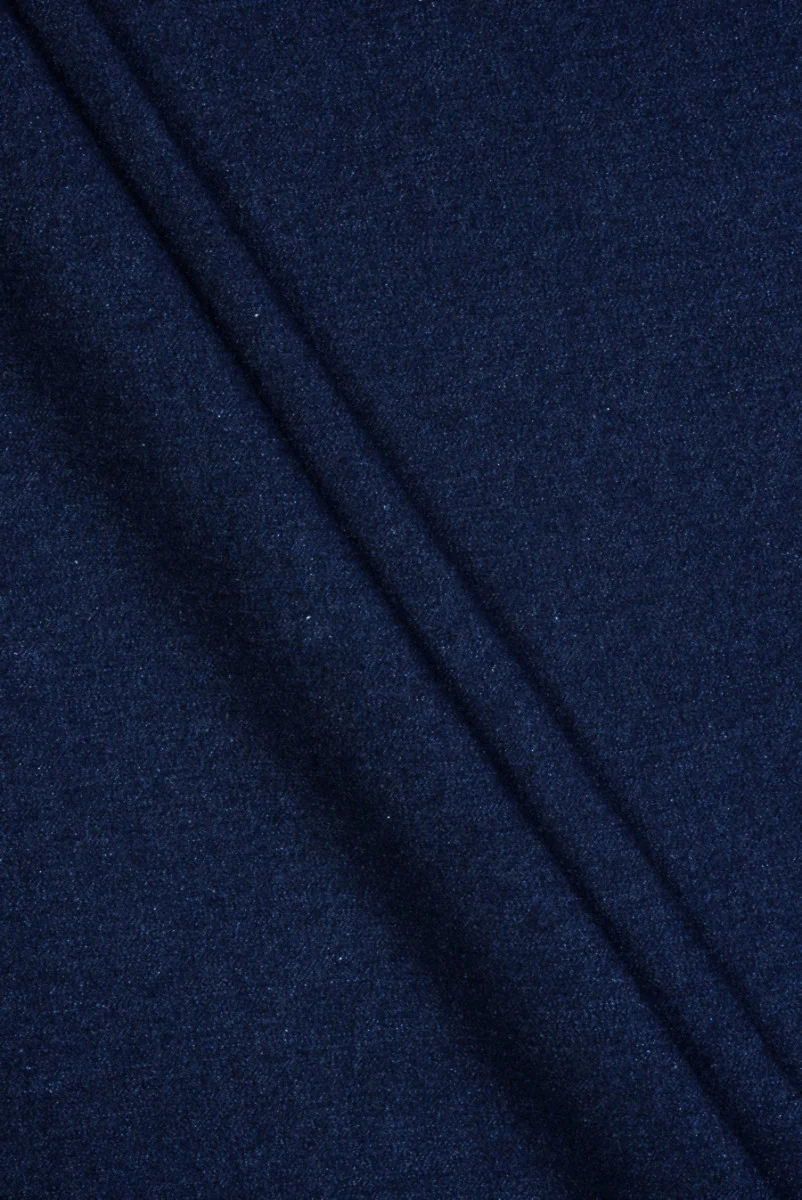 Denim-Stoff in dunklem Marineblau, gewebt aus Baumwolle mit Zusatz von Elasthan. Der Stoff ist mitteldick, elastisch, matt und leicht steif. Die Kette ist dunkelmarineblau und der Schuss hellblau, was den Effekt von Melange-Stoff ergibt. Ein klassisches Angebot, das sich perfekt zum Nähen von Hosen, Jacken, Kleidern oder Röcken eignet.