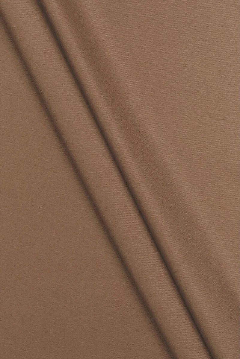 Italienischer Wollstoff mit der Zugabe von Elastan in hellbraunem Stoff. Ein Stoff von guter Qualität, er ist weich, deckend, elastisch und hat einen dezenten Glanz. Perfekt für klassische Kleidung wie Kleider, Röcke, Hosen und Damenjacken.