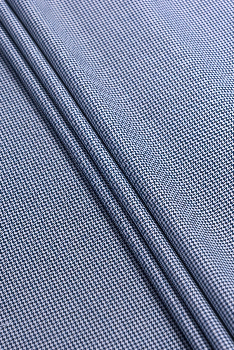 Italienischer Kostümstoff mit dem Motiv eines kleinen Hühnerfußes. Farben: weiß, schwarz, meerblau.