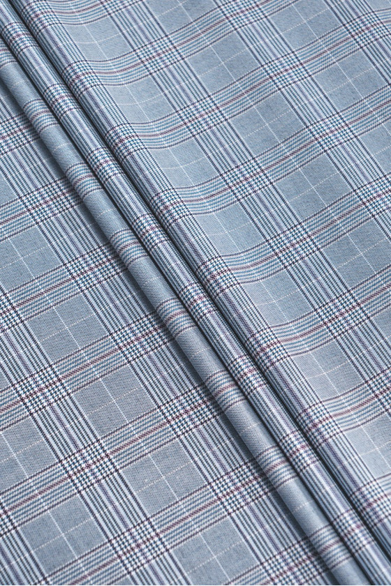 Kostümstoff in einem zarten Karo (auf blauem Grund weiß-braun kariert). Der Stoff besteht aus: Polyester 64%, Viskose 34%, Elasthan 2%, Gewicht 295. Stoff sanft elastisch. Wir empfehlen, Kleider, Röcke, Hosen, Jacken zu nähen. Der Stoff kann auf zarte Weise bei 30-40 Grad gewaschen werden.