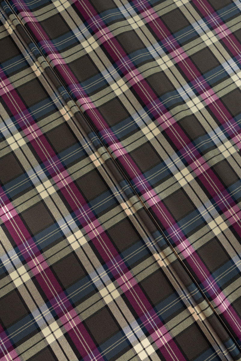 Italienisch karierter Kostümstoff (10 cm) in Beige, Lila, Blau und Olivgrün. Weicher Stoff mit einer dichten Webart, die an Wolle erinnert. Perfekt zum Nähen eines Anzugs, einer Hose, eines Rocks oder eines Kleides.