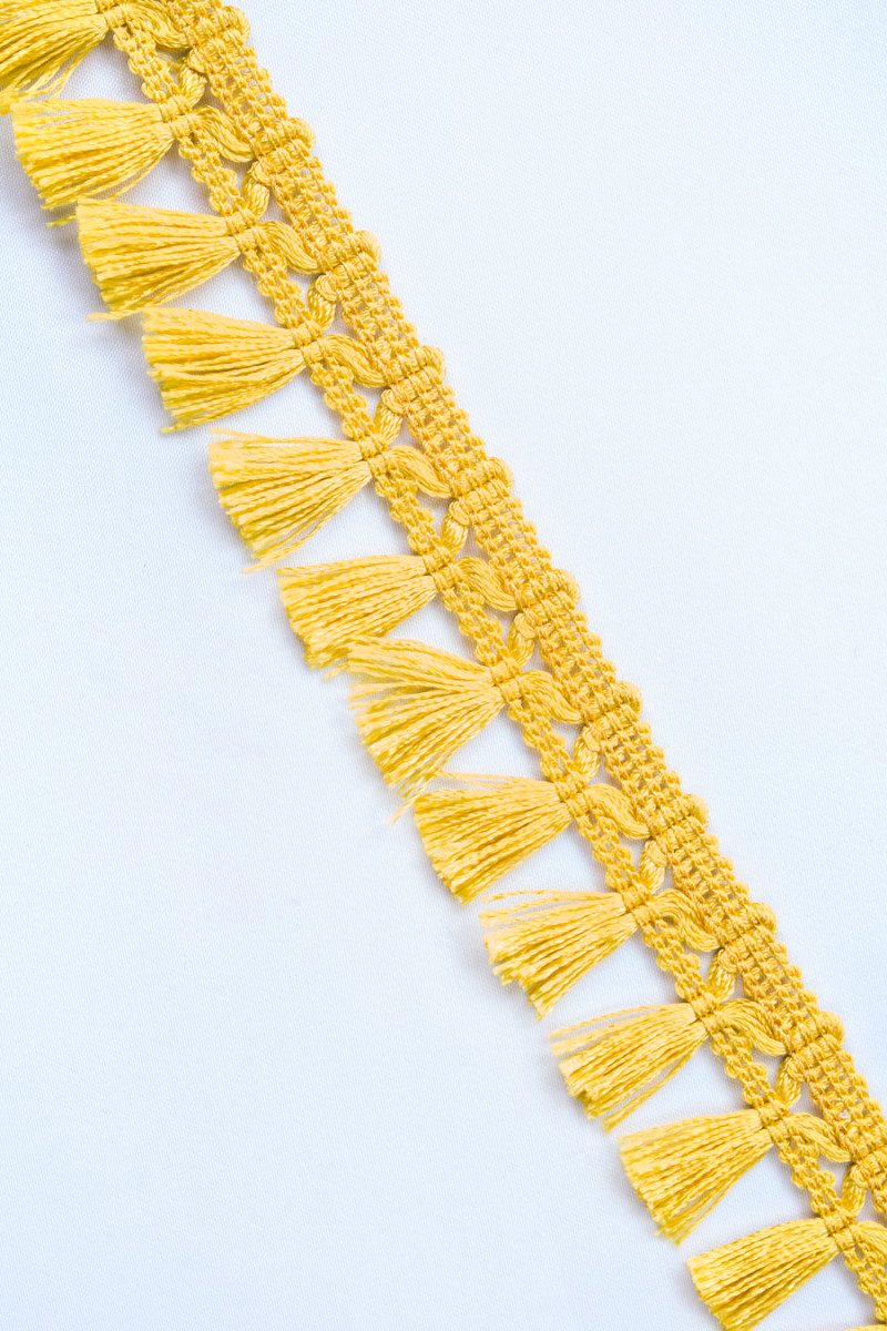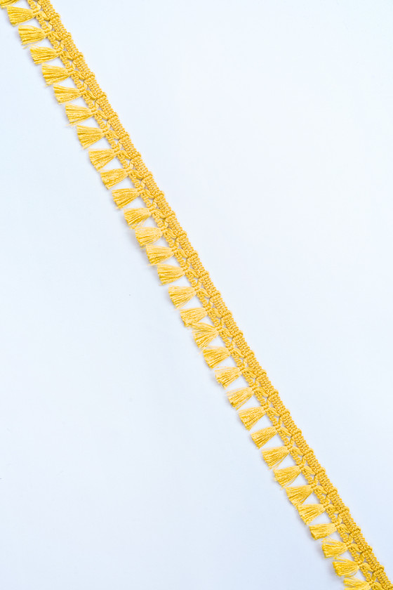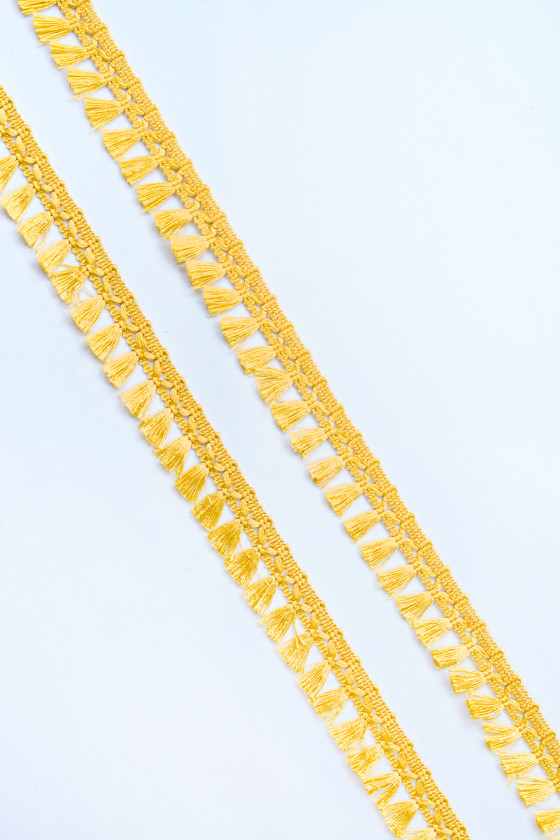 Italienisches Kurzwarenband in gelb mit einer Breite von 3cm. Das Band besteht aus Schnur, dekorative Quasten mit einer Länge von 1,7cm sind mit einer Breite von 1,3cm an den Gürtel genäht. Ein sehr interessanter Vorschlag, um den Stoff oder die Dekoration zu beenden.