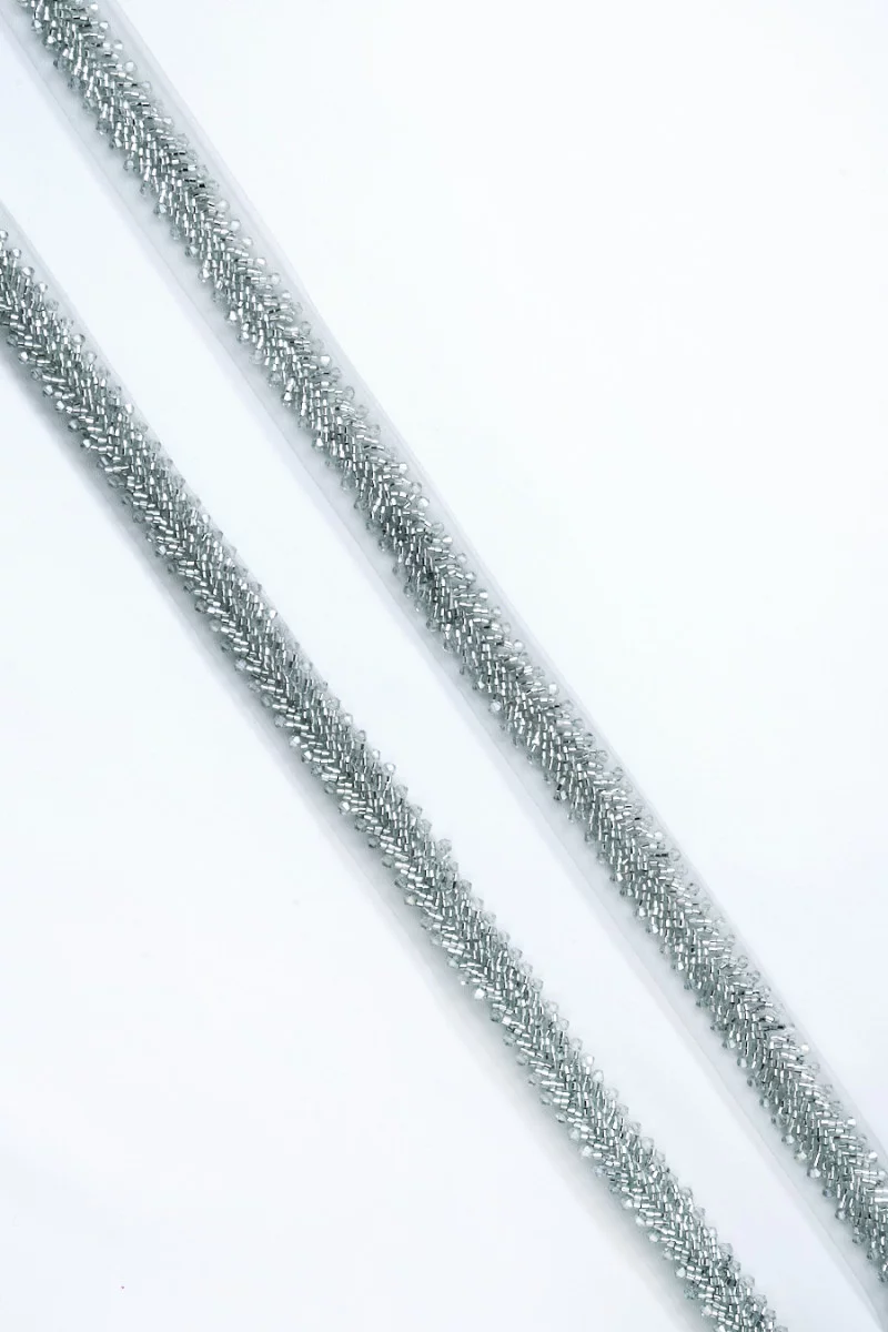 Italienisches Kurzwarenband in grauer Farbe mit einem grünen Tropfen 2cm breit, reich mit Perlen verziert. Das Band besteht aus zwei Arten von Perlen - kleiner, die Füllung bilden und größer an den Rändern - sie bilden ein Fischgrätenmuster. Das Ganze ist auf ein Tüllnetz in Grau genäht. Ein schöner Vorschlag, um ein elegantes Kleid, eine Bluse oder einen Rock zu dekorieren.