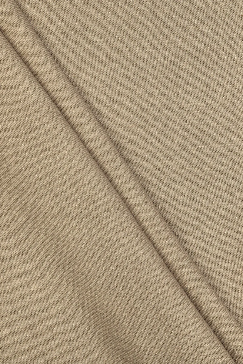 Italienischer Leinenstoff in Beige, zart mit Goldfäden verziert, wodurch das Ganze eine einzigartige Eleganz erhält. Der Stoff ist fleischig, unelastisch, leicht steif im Griff, locker gewebt und der Goldfaden sieht aus wie glänzender Glitzer.