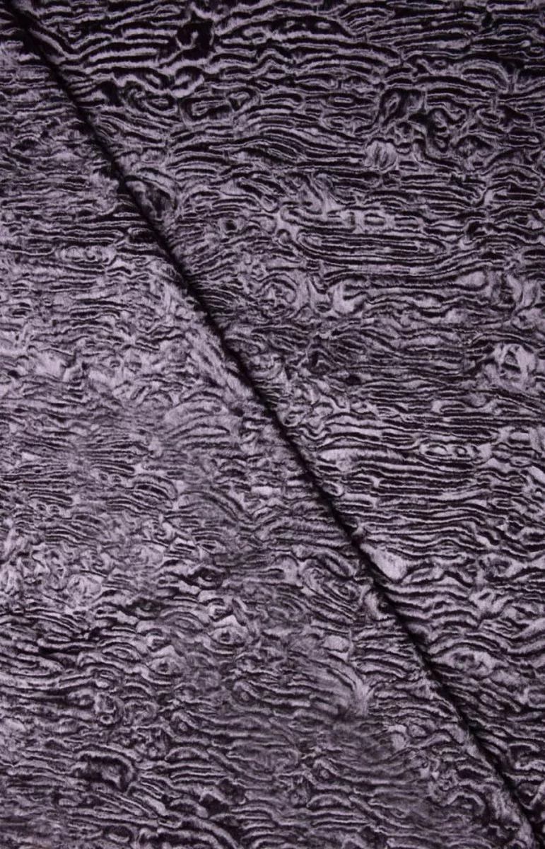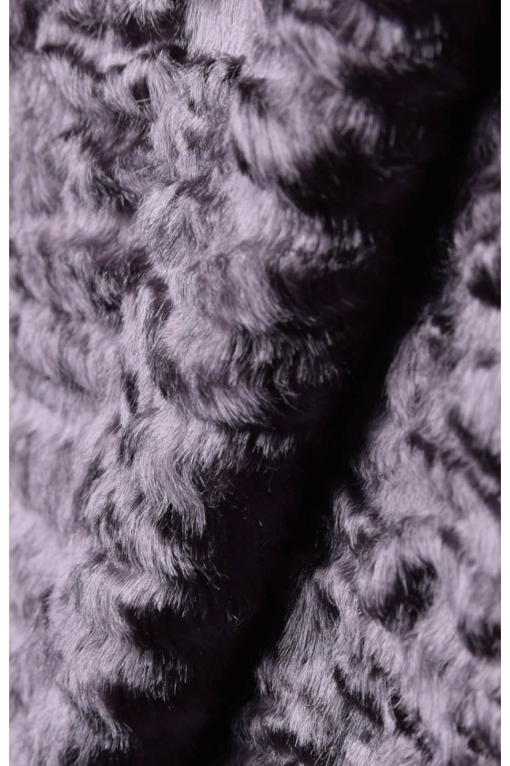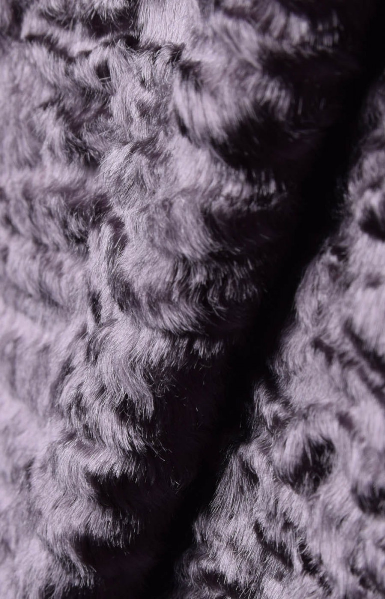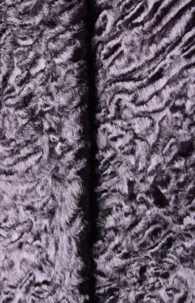 Öko-Fell in gedecktem Lila (helle Aubergine) mit kurzen Haaren. Die Textur ähnelt dem Fell von Caracules, der Stoff ist von mittlerer Dicke, unelastisch.