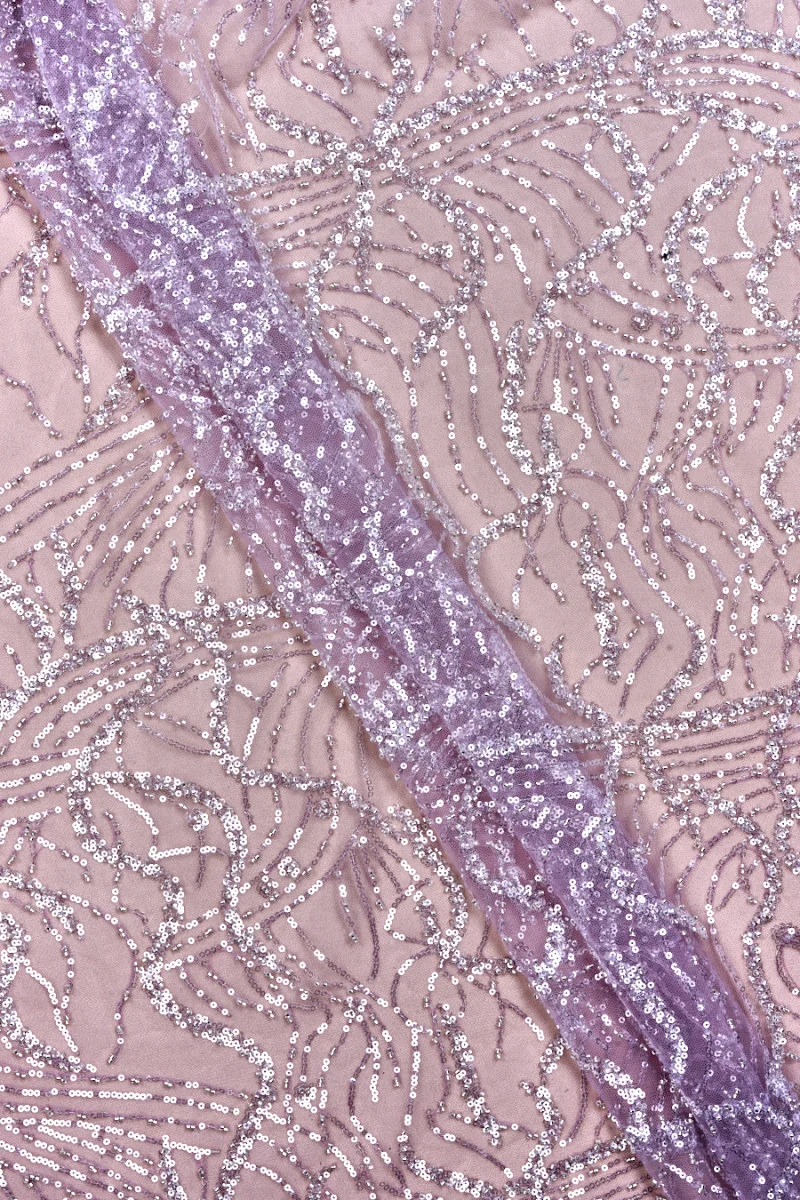 Italienischer Tüll mit klassischen fliederfarbenen Ösen, verziert mit Silberperlen und transparenten Pailletten, die Wellen erzeugen. Der Stoff ist sehr effektiv, leicht elastisch, transparent - er muss gefüttert werden. Die Breite des Stoffes beträgt 150 cm, die Breite des Musters (Pailletten und Perlen) beträgt 135 cm. Ein fantastischer Vorschlag, um ein Abendkleid, einen Rock oder eine Bluse in einer sehr interessanten Auflage zu nähen.