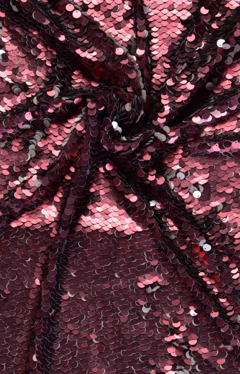 Wunderschöne Pailletten auf Viskose-Strick gestickt. Elastisches Gewebe. Die Pailletten drehen sich. Zum einen sind sie kirschfarben, zum anderen beige. Perfekt für Kleider, Blusen, Röcke.