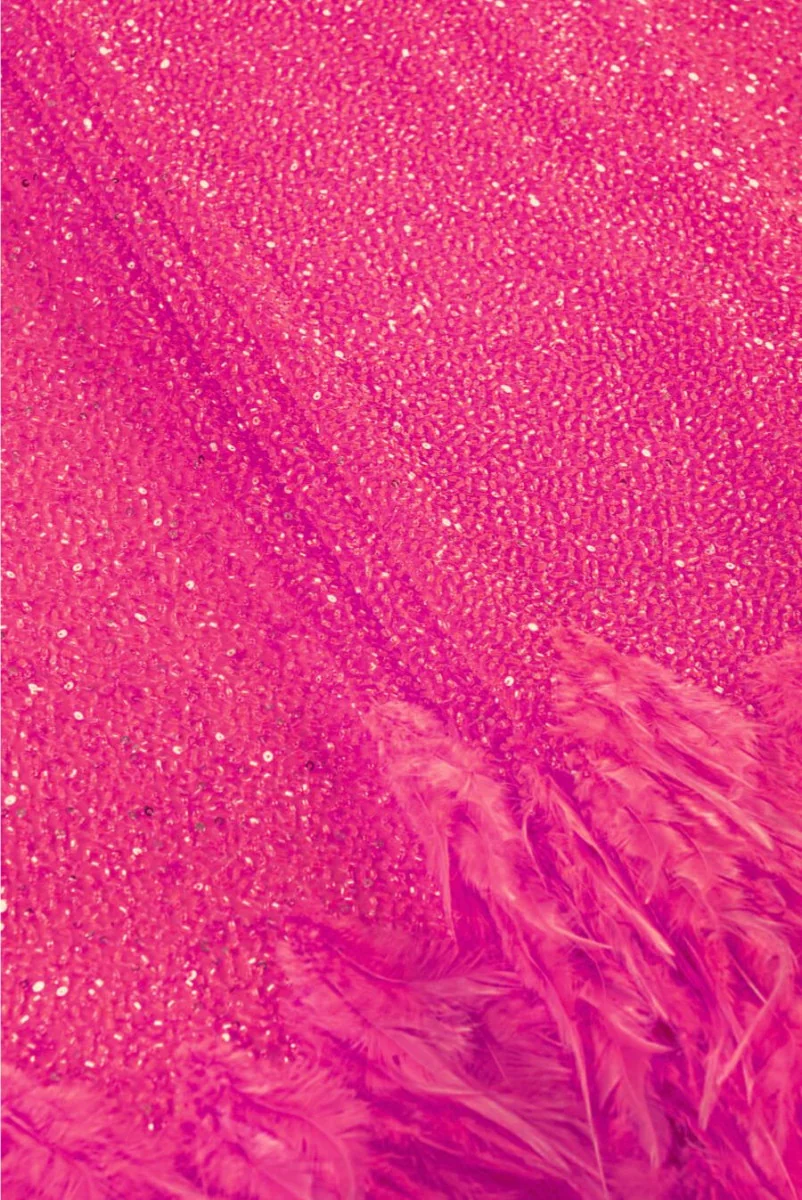 Schöner formeller Stoff in rosa Fuchsia, bestickt mit Perlen und einem breiten Band aus Naturfedern am unteren Rand (Breite 65 cm). Wir empfehlen, dafür ein Futter aus Seidensatin zu wählen, das die Wirkung des Outfits verstärkt. Bitte messen Sie die Stoffmenge pro Umfang.