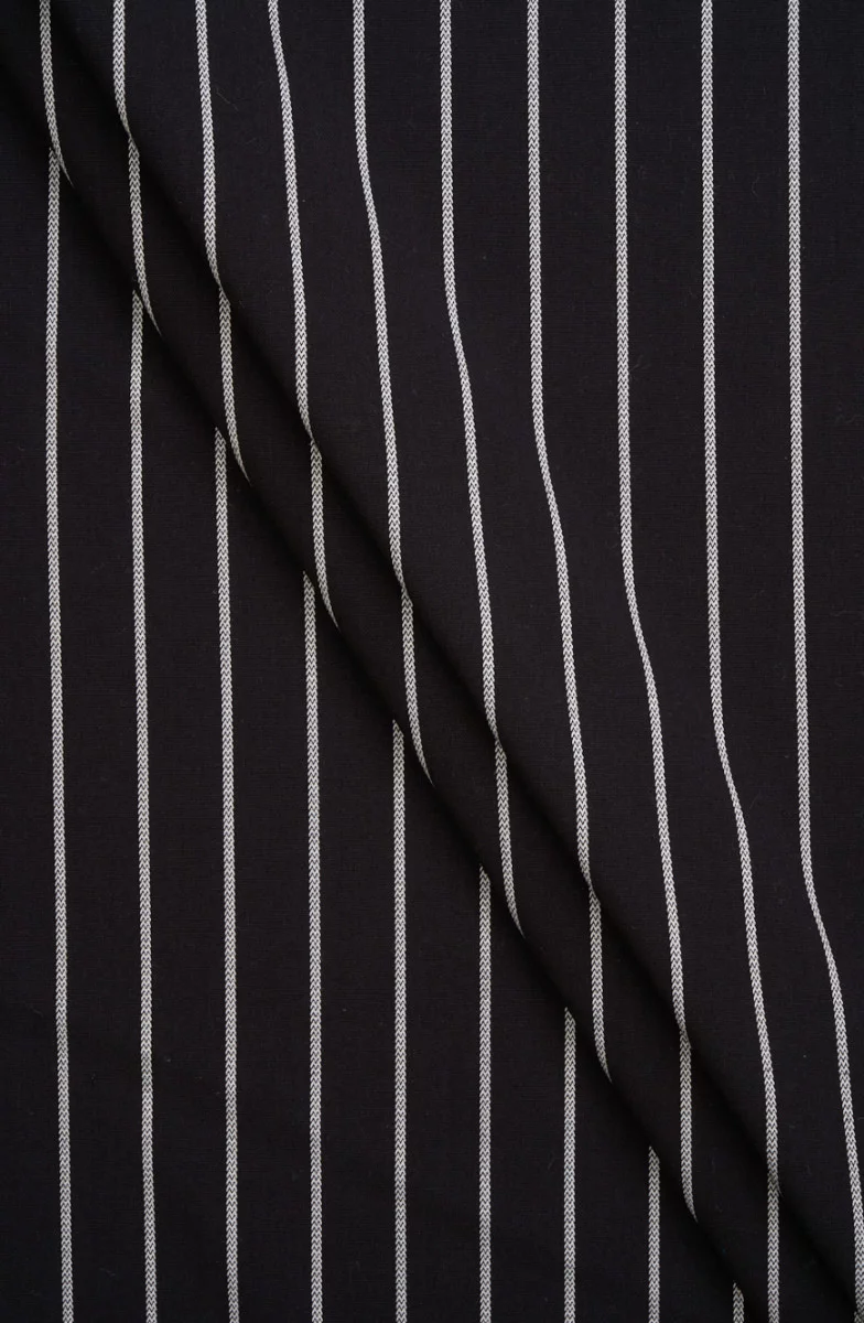 Italienischer Kostümstoff in Schwarz mit weißen Streifen, die sich alle 2 cm wiederholen. Elastisches Gewebe mit dichter Webart und glatter Oberfläche. Ein klassisches Angebot zum Nähen einer Jacke, eines Anzugs, eines Kleides oder eines Rocks.