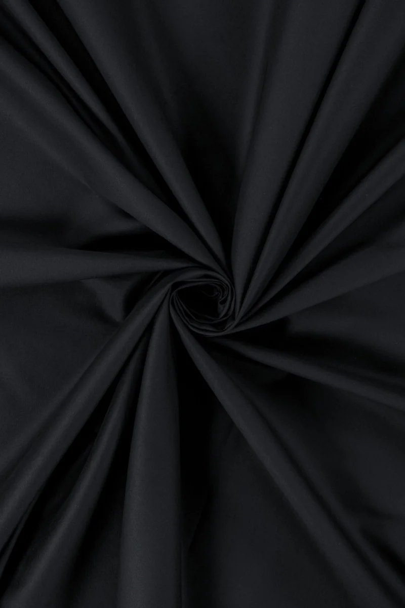 Taft-Polyestergewebe in Schwarz. Der Stoff ist dünn, unelastisch, leicht steif und mit einem schönen Glanz veredelt. Schwarz sieht in Abendoutfits toll aus. Es eignet sich perfekt zum Nähen eines Kleides, eines Rocks oder sogar eines leichten Mantels.