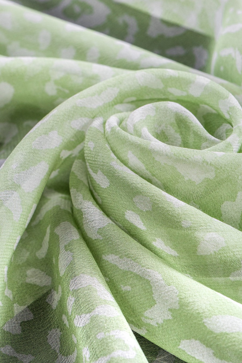 Seide georgette in der Farbe der grünen Pistazie in einem weißen Leoparden. Es ist ein matter Stoff, sehr zart, halbtransparent (erfordert Futter).