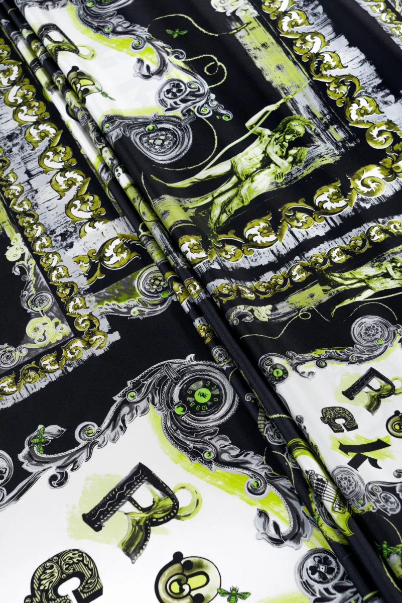 Italienischer 100 % Seiden-Köperstoff mit schwarzen und olivgrünen ROCK-Motiven. Seidenköper ist ein Stoff mit Köpergewebe, weich, sehr haltbar und sanft steif liegend. Perfekt zum Nähen eines Hemdes, Kleids, Rocks oder Schals/Schals.