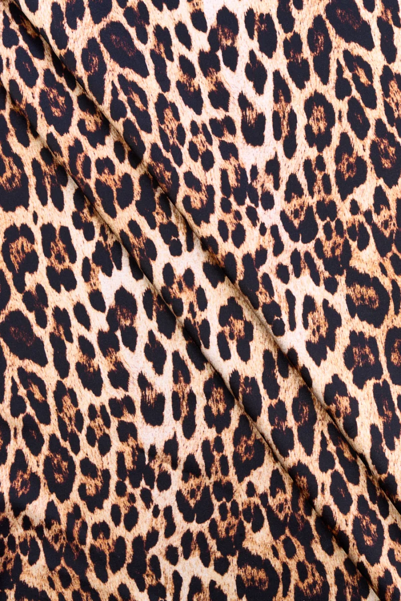 Italienischer Seidensatin mit Leopardenmuster in Schwarz und Braun auf beigem Hintergrund. Der Stoff ist weich, elastisch und fällt wunderbar. Ein fantastisches Angebot für Fans zeitloser Tiermuster.