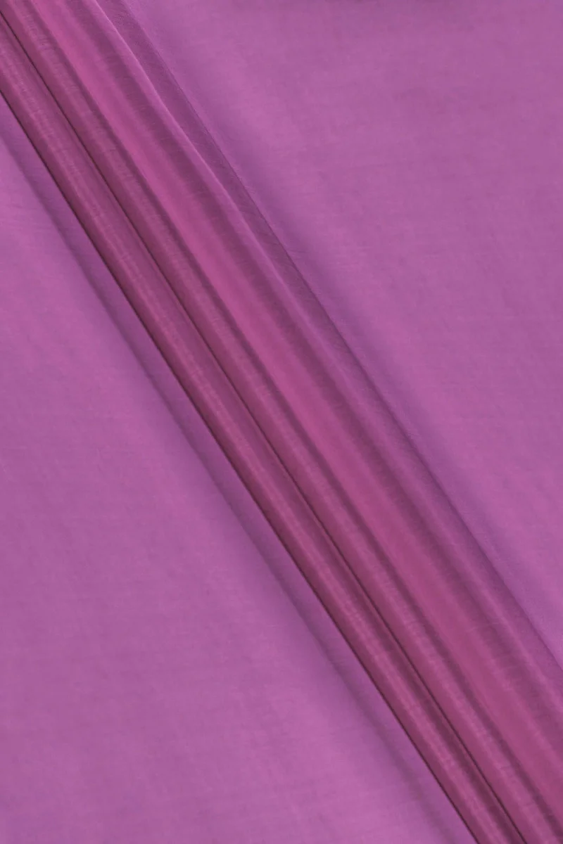 Italienischer Stoff aus 100% Seidenorganza in Lila mit einem Hauch von Fuchsiarosa. Natürlicher Seidenorganza ist ein dünner, transparenter, aber steifer Stoff mit einem zarten Glanz, der für Seidenstoffe charakteristisch ist. Perfekt zum Nähen eines Kleides, einer Bluse, eines Hemdes, eines Rocks.