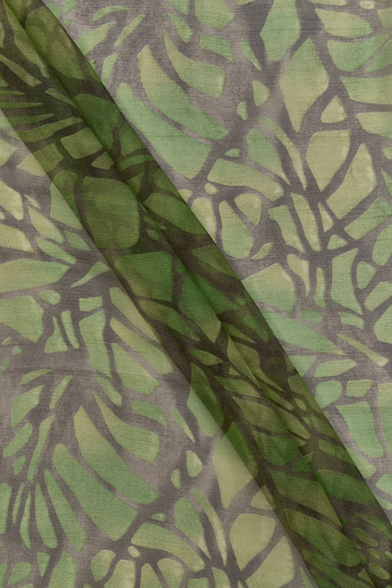 Italienischer Chiffon aus 100% Seide mit einem grünen Buntglasmotiv auf dunkelgrauem Hintergrund, das Blattmuster darstellt. Die Grafiken sind dicht platziert und schattiert, was einen interessanten Effekt des Ganzen erzeugt. Der Stoff ist transparent, matt, unelastisch, sehr leicht und zart gefaltet. Wir empfehlen es für luftige Kleider, Röcke und Blusen, z.B. mit Rüschen.