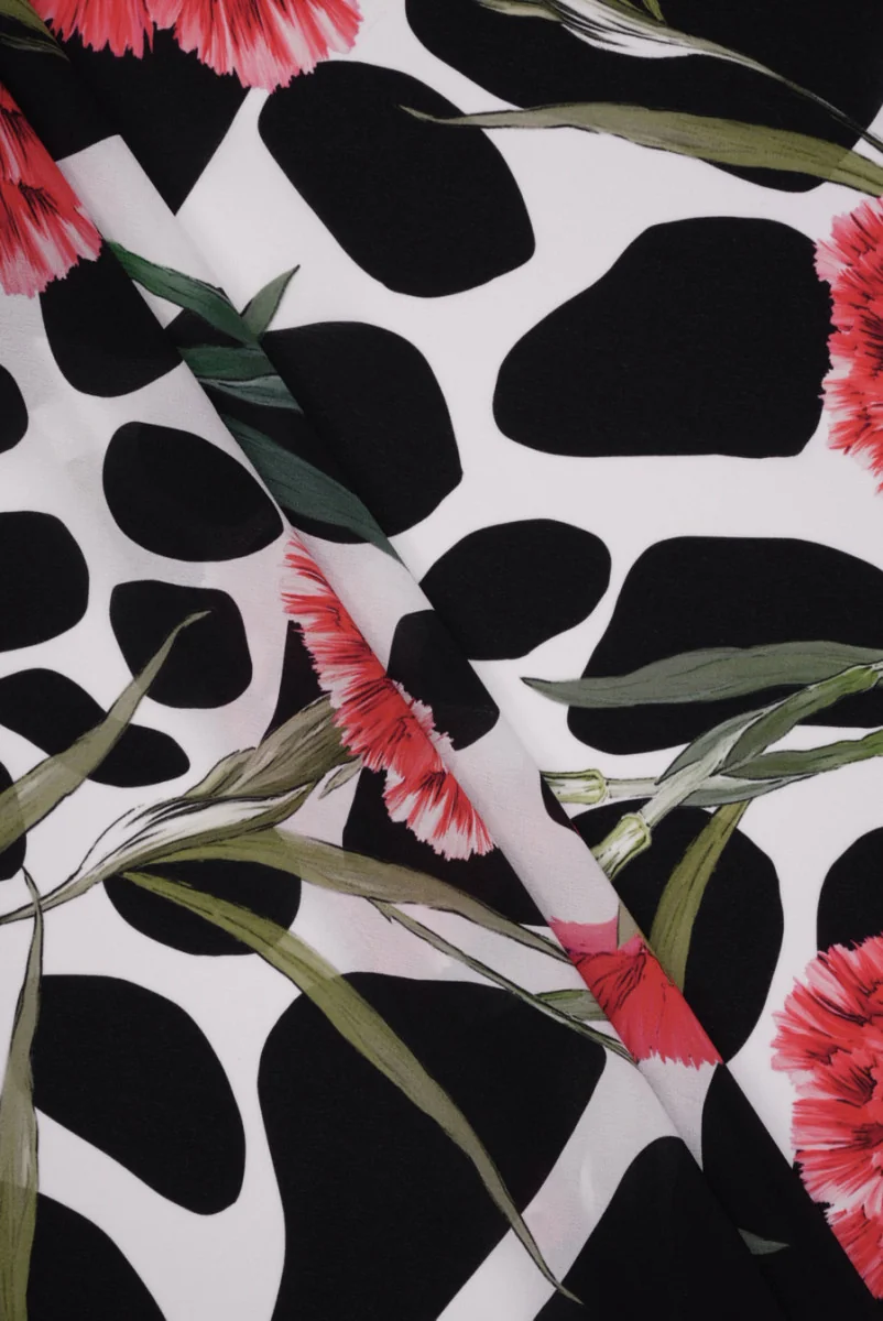 Italienischer Crêpe aus 100% Seide mit einer sehr interessanten Kombination aus Tiermuster und Blumen. Auf cremefarbenem Hintergrund sind schwarze Flecken dicht bedruckt und mit roten Nelkenblüten beschriftet. Der Stoff ist unelastisch, dünn, leicht transparent, sehr leicht und luftig. Es ist ein schönes Angebot, eine elegante Bluse, ein Kleid oder einen Rock für einen besonderen Anlass zu nähen.