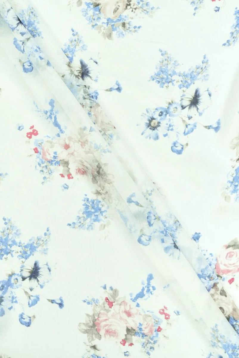 Italienischer Seiden-Viskose-Musselin mit einem Motiv aus zarten, blumigen Sträußen in Rosa-, Grau- und Blautönen auf cremefarbenem Hintergrund. Einzelne Sträuße unterscheiden sich in Blütenarten und Farben, eine Blütentraube ist etwa 13 cm breit. Das Material ist zart, transparent, sehr leicht und luftig, zusätzlich mit einem dezenten Glanz veredelt. Ein romantischer und pastellfarbener Vorschlag für den Sommer, aus dem Sie Kleider mit Rüschen, luftige Röcke, leichte Blusen und Schals zaubern können.