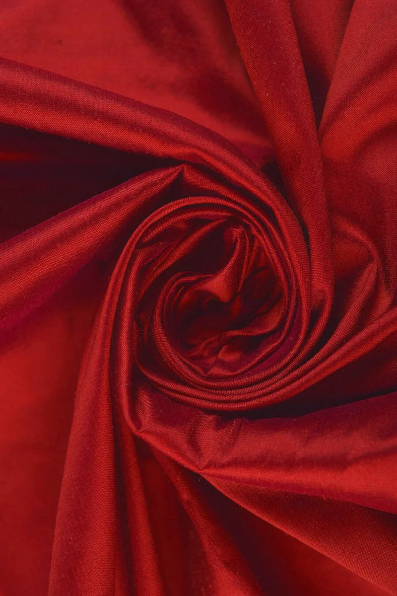 Italienischer Stoff aus 100% Shandong-Seide in roter Farbe. Der Stoff ist glatter mit leichten Verdickungen.