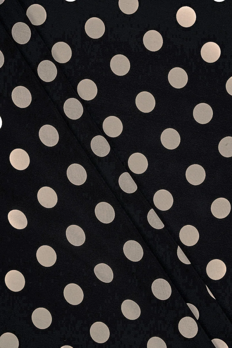 Italienischer Crêpe aus 100% Seide in Schwarz mit beigem Polka-Dot-Motiv. Das Muster hat einen regelmäßigen Abstand und einen Durchmesser von 2,1 cm. Der Stoff ist dünn, leicht, luftig, weich und unelastisch. Es eignet sich perfekt zum Nähen einer Bluse, eines Hemdes, eines Kleides und eines Rocks. Ein zeitloses Muster für alle, die die "Klassiker" lieben