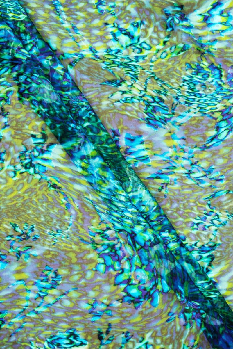 Italienischer Stoff aus 50% Naturseide und 50% Viskose, gewebt in einer Devore-Webart. Das Material ist eine Kombination aus Satinmustern mit Chiffon-Hintergrund, das Motiv ähnelt einem Leopardenmuster und ist in den Farben Kornblume und Grün gehalten. Der Stoff besteht zu 100% aus Naturfasern, was ihn sehr angenehm zu bedienen macht. Ein fantastisches Angebot für Herbstoutfits.