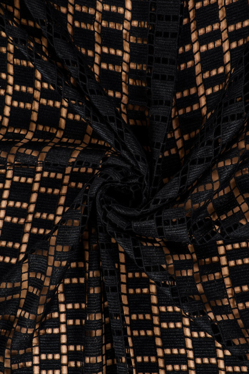 Italienische Guipure Spitze in Schwarz im Motiv unregelmäßiger Gehörknöchelchen. Stoff ideal zum Nähen einer eleganten Bluse, Rock oder Kleid. Zusammensetzung: Naturwolle, Polyester