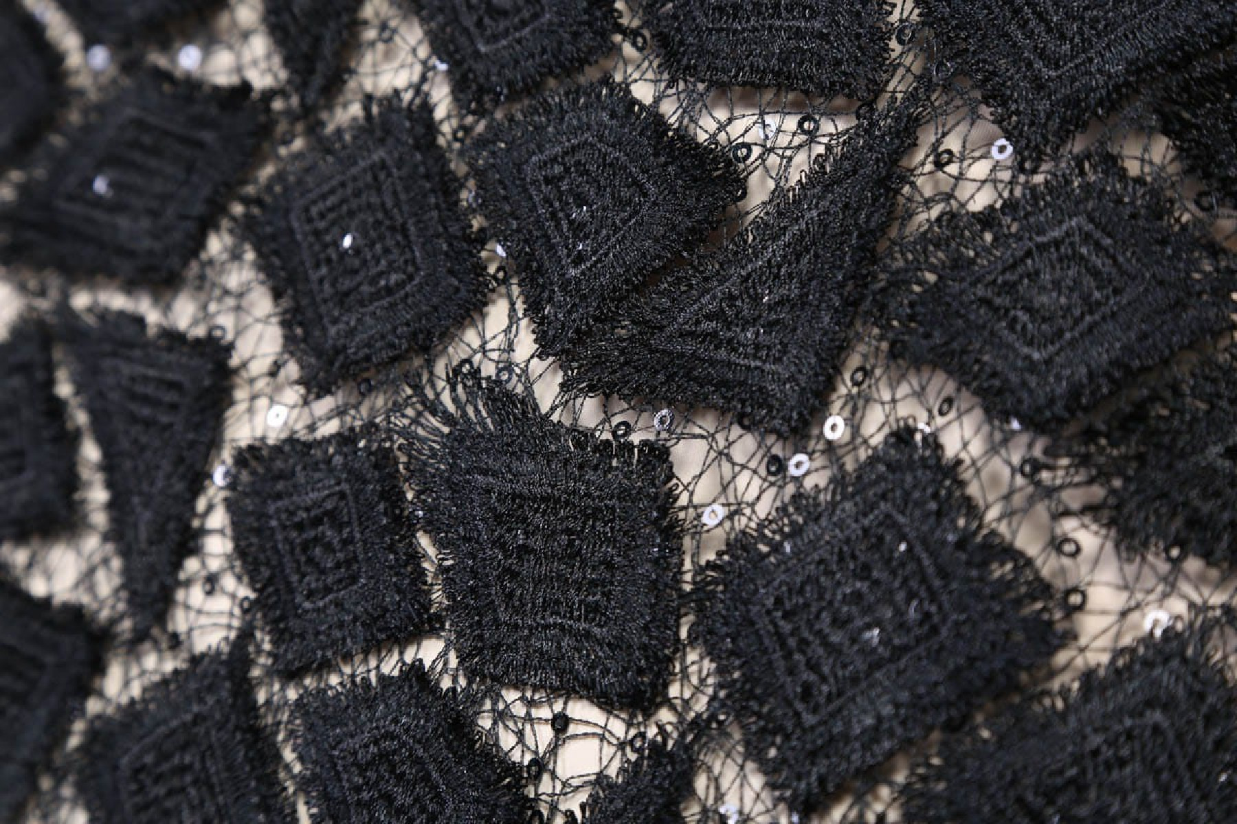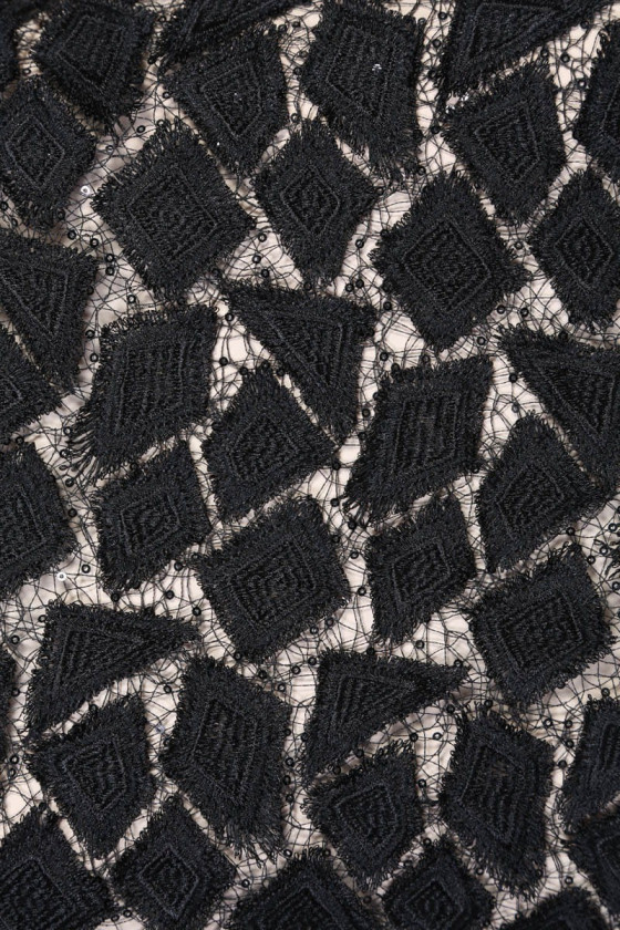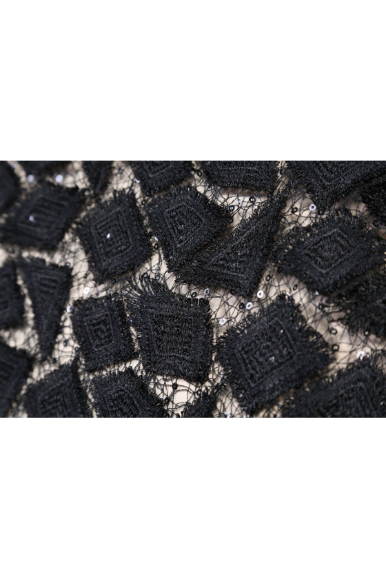 Originelle Guipure-Spitze mit aufgenähten schwarzen Pailletten, die ihm Eleganz und Raffinesse verleihen. Perfekt für Abendkleider und Blusen.