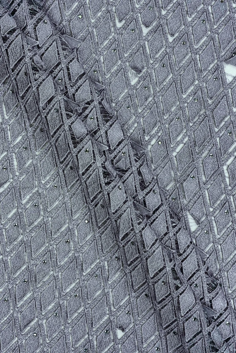 Schöne Guipure in Grau in einem geometrischen Muster. Guipure hat klebrige Symilki. Die Rauten, aus denen es besteht, sind an zwei Seiten genäht, und die beiden Seiten bleiben frei, was den Eindruck der Geräumigkeit des Stoffes erweckt. Perfekt für Kleider oder Blusen.