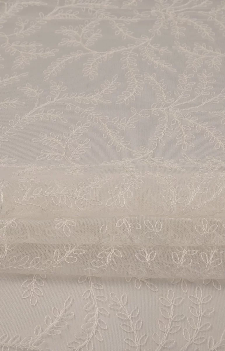 Hochzeitsspitze mit einem klassischen, dichten Ecru-Muster ist nicht mit einem dekorativen Zahn versehen. Die Spitze ist zart, fühlt sich weich an und sitzt gut.