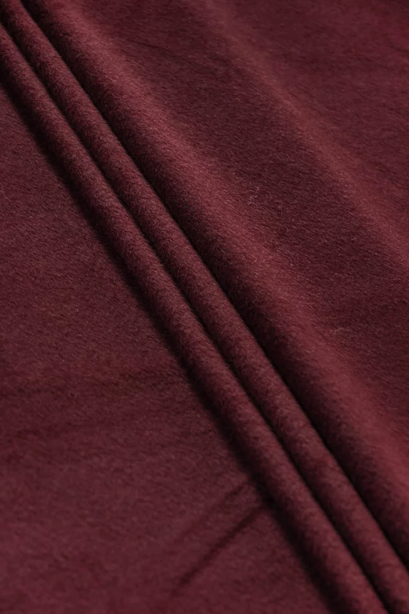 Italienischer Mantelstoff in dunklem Burgunderrot mit kurzem Flor. Gewebt aus natürlicher Wolle mit einer Beimischung von Alpaka und Polyamid. Der Stoff mit Alpakawolle hat eine ausgezeichnete Luftdurchlässigkeit und isolierende Eigenschaften, ist florig und sehr weich. Perfekt zum Nähen eines Mantels, einer Jacke, einer Weste.