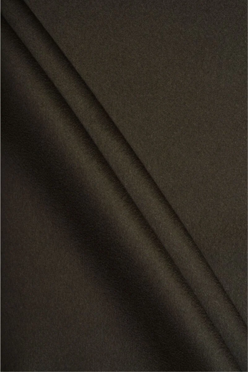 Italienischer Mantelstoff mit Zusatz von Kaschmir in Braun mit einem Hauch von Grün, doppelt. Der Stoff ist etwas steif, unflexibel, dicker und fleischiger. Es ist ideal für Oberbekleidung (Mantel, Jacke, Weste), da es wärmt und gleichzeitig die Haut atmen lässt. Chemische Reinigung empfohlen.