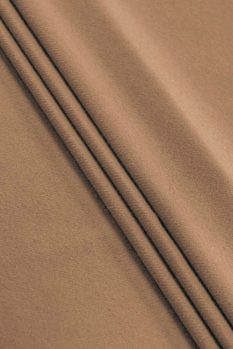 Italienischer Mantelstoff in Kamelbeige mit Köperbindung (Köper). Gewebt aus natürlicher Wolle, Polyamid und Kaschmir. Wollstoffe eignen sich hervorragend für Oberbekleidung (Mantel, Jacke, Weste), da sie wärmen und gleichzeitig die Haut atmen lassen.