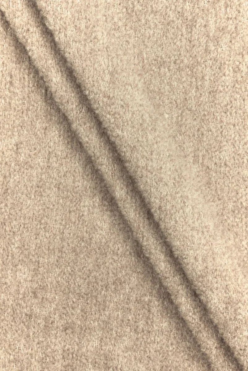 Italienischer, exklusiver Mantelstoff in Beige. Es ist aus natürlicher Wolle mit einer Beimischung von Alpaka und Polyamid gewebt und hat ein längeres, gedrehtes Haar, das an eine Bouclé erinnert. Der Stoff ist weich und fühlt sich sehr angenehm an, perfekt zum Nähen eines Mantels, einer Jacke oder einer Superweste. Ein schönes und originelles Angebot für alle, die ungewöhnliche Stoffe mögen.