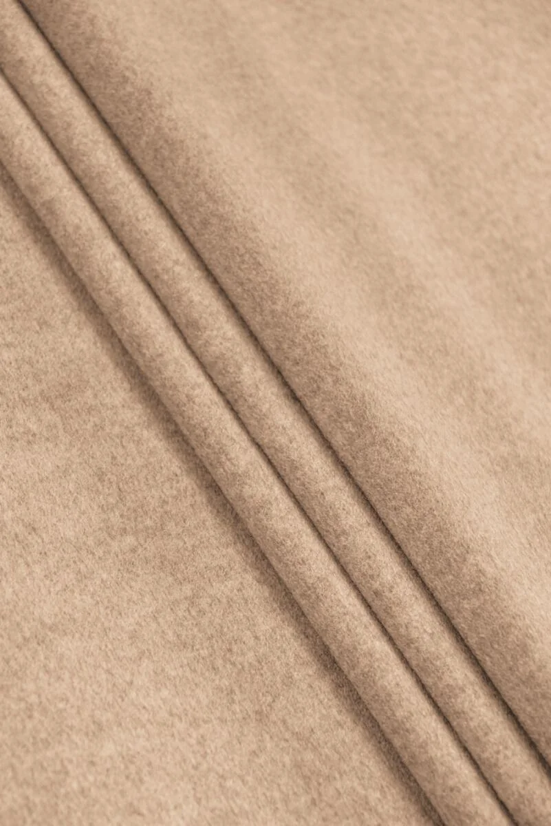 Italienischer Mantelstoff aus natürlicher Wolle mit Zusatz von Kaschmir in beiger Melange-Farbe. Der Stoff ist mitteldick, liegt weich und ist unflexibel. Es ist ideal für Oberbekleidung (Mantel, Jacke, Weste), da es wärmt und gleichzeitig die Haut atmen lässt. Die Beimischung von Kaschmir trägt zu seiner Noblesse und seinem zarten Glanz bei. Ein schönes und klassisches Angebot für Menschen, die zeitlose Stoffe mögen.