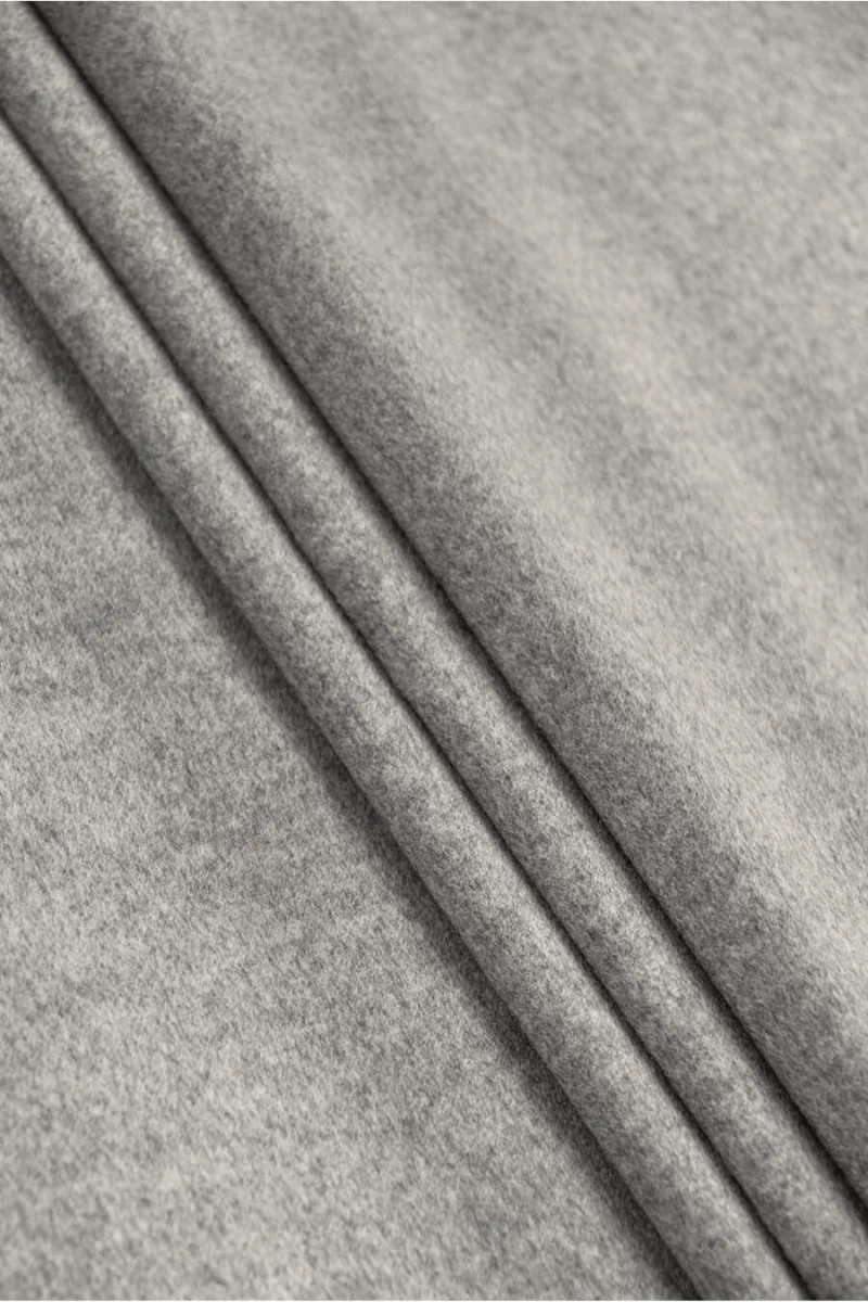 Italienischer Mantelstoff, gewebt aus Vermin-Wolle mit einer Mischung aus Kaschmir und Seide. Das Material ist doppelseitig: grau meliert auf der einen Seite und beige melange auf der anderen Seite. Der Stoff ist weich zu verlegen, unelastisch und fühlt sich sehr angenehm an. Wollstoffe eignen sich hervorragend für Oberbekleidung (Mantel, Jacke, Weste), da sie wärmen und gleichzeitig die Haut atmen lassen. Die beste Qualitätskomposition lässt den Stoff nicht nur schön, sondern auch sehr warm aussehen. Der Stoff ist perfekt für Menschen, die Klassiker am liebsten mögen.
