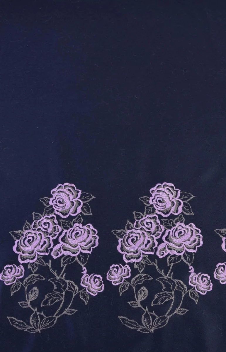 Italienischer Mantelstoff aus 100% Wolle in Marineblau, an einer Kante befindet sich ein ca. 47 cm breiter melierter, floraler Streifen gestickt - der Stoff ist umlaufend vernäht.