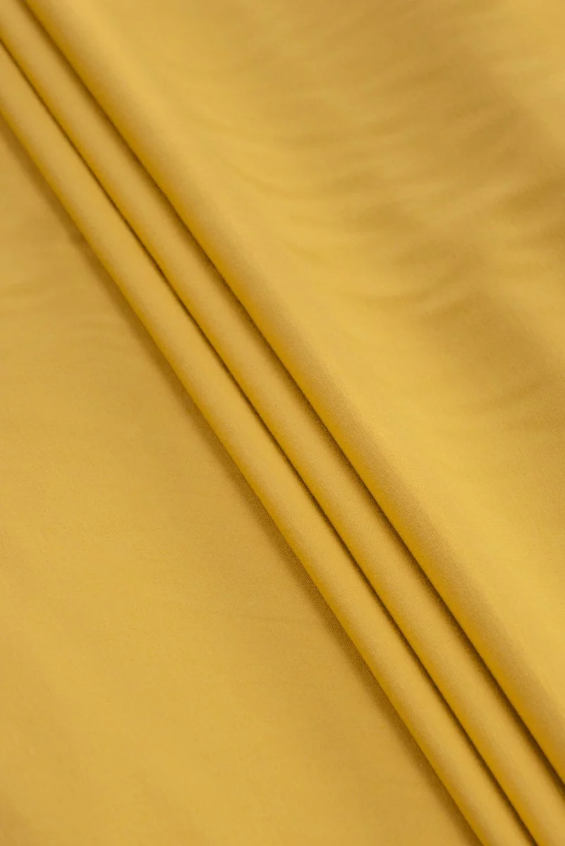 Kompakter, elastischer Jersey-Strickstoff in sonnengelber Farbe. Wir empfehlen es zum Nähen bequemer Kleidung - Kleider, Röcke, Trainingsanzüge.