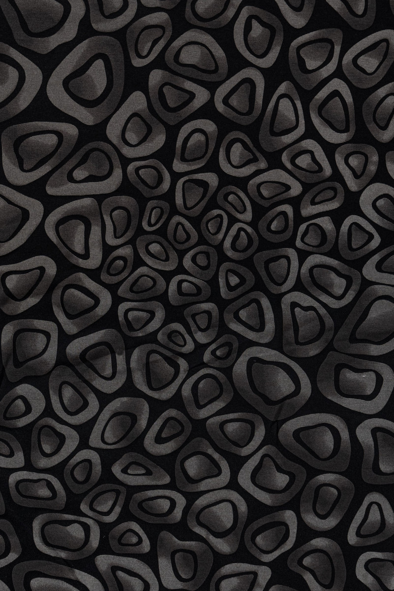 Italienischer Jersey-Acetat-Strickstoff in Schwarz mit einem Motiv aus grauen, geometrischen Mustern, die an etwa 6 cm große Patches erinnern. Jersey-Strick ist ein blickdichter, weich fallender Strickstoff, der ungefüttert genäht werden kann.