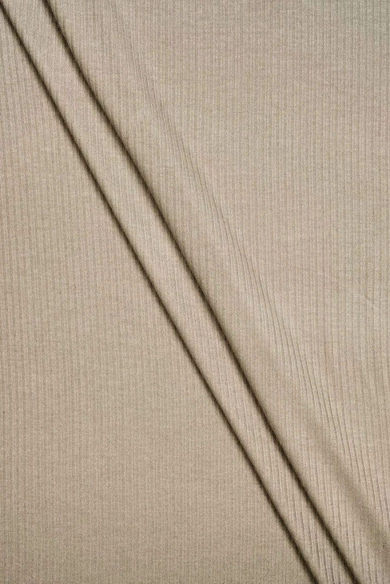 Italienisches Viskose-Strickgewebe in Mokkafarbe, hergestellt in einem zarten, dichten Streifen. Die Breite eines Streifens beträgt 3 mm und der Abstand zwischen dem Muster 2 mm. Das Gestrick ist weich, matt, eher dünn, aber blickdicht, flexibel und sehr angenehm zu greifen. Es eignet sich perfekt für Blusen, Tops, taillierte Kleider und Röcke.
